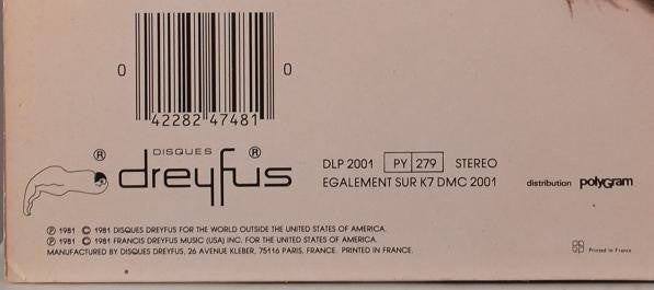 PY 279 code issue with barcode. Other cat# "DLP 2001" issues (PolyGram distributor) are available: Transitional "DLP 2001" cat# and "PolyGram" distributor stickers on previous CBS issue PY 279 code, no barcode PG 278 code (sticker), with barcode PY 278 code, with barcode, add. cat# 824 748-1 Cover: ℗ 1981 © 1981 Disques Dreyfus for the world ouside the United States Of America. ℗ 1981 © 1981 Francis Dreyfus Music (USA) Inc. for the United States Of America. Printed in France. Inner sleeve: Thanks to M. Geiss, MCI, Music Land, RSF, Fairlight, Oberheim & MDB. Labels: ℗ © 1981 Disques Dreyfus copyright by Francis Dreyfus Music Fabriqué en France