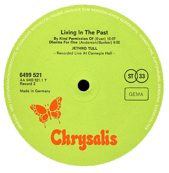 Released in a structured gatefold sleeve, incl. booklet. Green label design. Boxed Y behind cat# on the rear cover. Track A1: from the album "This Was" recorded at Sound Techniques, London in July 1968. Tracks A2 & A3: recorded at Morgan Studio, London in November 1968. Track A4: recorded at Vantone Studio, West Orange, New Jersey, U.S.A. in February 1969. Track A5: recorded at Western Recorders, Los Angeles, California, U.S.A. in March 1969. Track A6: from the album "Stand Up" recorded at Morgan Studio, London in April 1969. Tracks B1 & B2: recorded at Morgan Studio, London in November 1969. Tracks B3 & B4: recorded at Morgan Studio, London in December 1969. Track B5: from the album "Benefit" recorded at Morgan Studio, London in January 1970. Tracks B6 & D1: recorded at Morgan Studio, London in June 1970. Tracks C1 & C2: recorded live at Carnegie Hall, New York in November 1970 at a charity concert given by Jethro Tull in aid of Phoenix House, a New York drug reabilitation centre. Track D2: from the album "Aqualung" recorded at Island Studio, London in December 1970. Tracks D3 to D7: recorded at Sound Techniques, London in May 1971. Published by Chrysalis Music Ltd./Slezak Musikverlag GmbH B6, D1 to D7 published by Ian Anderson Music Ltd. Made in Germany
