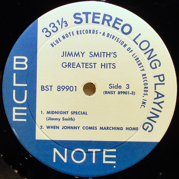 Blue/white Blue Note labels with rim text "BLUE NOTE RECORDS • A DIVISION OF LIBERTY RECORDS, INC." it is also a label variation: the writers credits per track are printed right under the track titles and not next to them. Also, the fonts used for the cat.nrs., main artist name and album title differ from this version, it's immediately clear when checked with an A/B comparison [see and compare images.