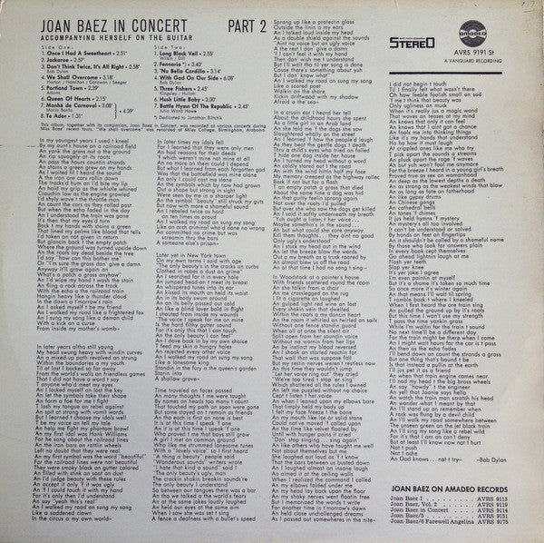 "This album, together with it's companion, Joan Baez in Concert, was recorded at various concerts during Miss Baez' recent tours. "We Shall Overcome" was recorded at Miles College, Birmingham, Alabama."