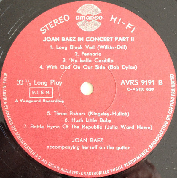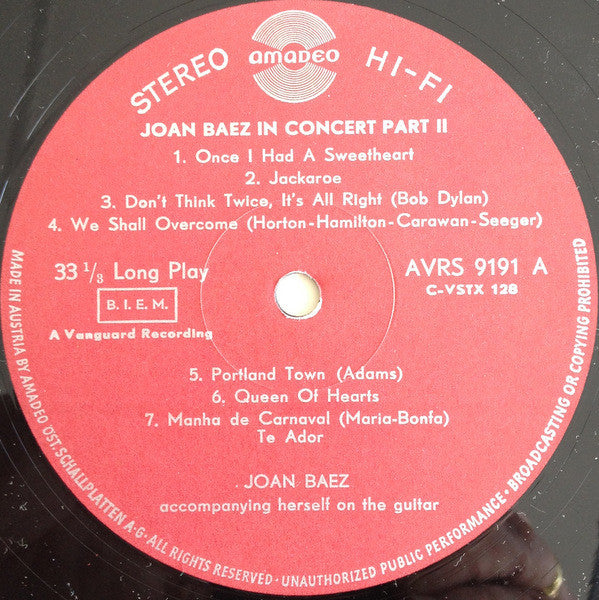 A1. Once I Had A Sweetheart 2:51 A2. Jackaroe 2:57 A3. Don't Think Twice, It's All Right 2:58 A4. We Shall Overcome 3:18 A5. Portland Town 2:39 A6. Queen Of Hearts 2:15 A7. Manhã De Carnaval 3:08 A8. Te Ador 1:31 B1. Long Black Veil 2:55 B2. Fennario 3:40 B3. 'Nu Bello Cardillo 3:14 B4. With God On Our Side 6:08 B5. Three Fishers 2:45 B6. Hush Little Baby 2:00 B7. Battle Hymn Of The Republic 2:45