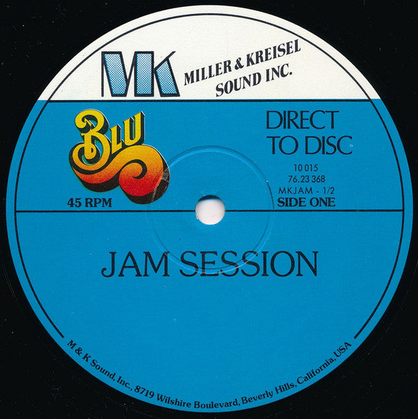 Similar to [r1657029, but different front cover and back cover. On front cover printed in white letters "JAM SESSION". Back cover shows a different picture, tracklist is missing.