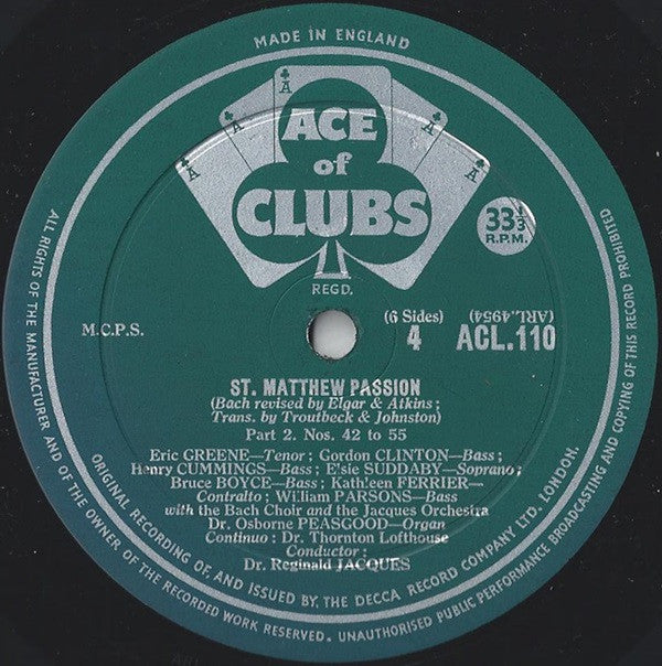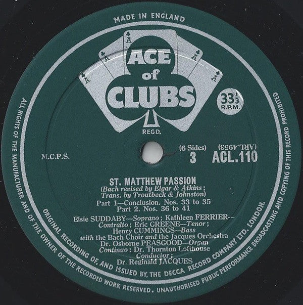 This complete recording of the Bach Choir's traditional performance of the St. Matthew Passion was originally published on 78s in November 1948. it has now been successfully transferred to microgroove in response to many requests from the musical public.