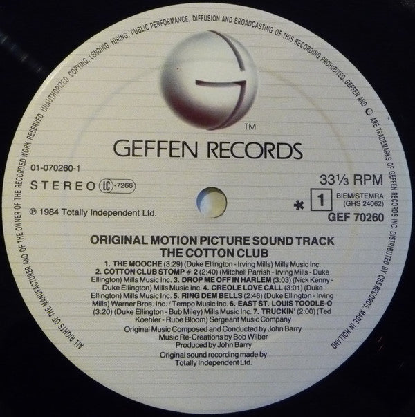 Soundtrack to Francis Ford Coppola movie "Cotton Club", starring Richard Gere, Gregory Hines, Diane Lane, Lonette McKee, co-starring Bob Hoskins, James Remar, Nicolas Cage, Allen Garfield and Fred Gwynne. Music by John Barry, Director of Photography Stephen Goldblatt, B.S.C., Costumes designed by Milena Canonero, Production Designer Richard Sylbert, Supervising Editor Barry Malkin, Producer Consultant Milton Forman, Co-Producers Sylvio Tabet and Fred Roos, Executive Producer Syson Lovell, Line Producer Barrie M. Osbourne & Joseph Cusumano, Story by William Kennedy & Francis Coppola and Mario Puzo, Screenplay by William Kennedy & Francis Coppola, Produced by Robert Evans. ⓒ 1984 ORION Pictures Corporation.