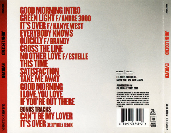 I thank God for my family and the gift of music. Thanks to my entire family (the Stephens and the Lloyds) especially Dad, Mom, Bump, Vaughn & Missy. Thanks to all my extended family and friends in Springfield, Ohio | To my co-creators on this album: KP, Kanye West, Malay, Pharrell, will.i.am, Trevor Horn, Andre 3000, Ne-Yo, Brandy, Estelle, Rick Nowels, Devo Springsteen, Dave Tozer, Scarr, Supa Dupes, Midi Mafia, Shannon Sanders, Drew Ramsey and Jessyca Wilson | Thanks to my great management at TAO/The Artist Organization: Gary Gersh, Ty Stiklorious, Greg Nishimura-Seese, Rick Schaefer & Noah Gersh. To The G.O.O.D. Music Team: Gee Robertson, Al Branch & Don C. To Dona West, rest in peace. My business management team: David Levin & Gina Gomez. My booking agents: Mitch Rose, Emma Banks and the rest of the team at CAA. My attorney: Aaron Rosenberg. My JL Ventures partner, Kweli Washington. My publishers at Cherry Lane | Thanks to everyone at the Sony BMG. Special thanks to: Rob Stringer, Steve Barnett, Mark Di Dia, Lisa Ellis, Yvette Noel-Schure and the publicity staff, Quincy Jackson, Tom Donnarumma, Kathy Baker, Grace Lee, Andre Morris, Juli Knapp, Denise Gatto, Brad Davidson, Mike Lieberman, Ayelet Schiffman and the entire radio staff. To Karen Demeusy and the entire Sony MBG international marketing team, thanks and see you all soon | To my band: Swiss Chris, Sharief, Tara Michel, Jessyca Wilson, Vaughn Anthony, Kenny Wright, Eugene "Man-Man" Roberts, Josh Valleau, Steve Tirpak, Allen "Bizkit" Arthur, Clayton Reilly. To my tour manager Jeff Christie ("Leave it!") and the rest of the crew that holds me down on the road: Hassan Smith, Ron "Bump" Stephens, Malcolm Martin, Perry Poe, Sean Richards and the production crew. Thanks to my throat doctor Scott Kessler. To Lisa Sellers, my stylist. To Nabil Elderkin and Vincent Peters, photographers. To Jacob Donnelly and the online team | Thanks to all the radio and television station who supported my singles | To all my fans and supporters, especially those in the John Legend Network (led by Nikki Noble), thanks for your loyal support. Thanks to all my good friends. And to my love, Chrissy.