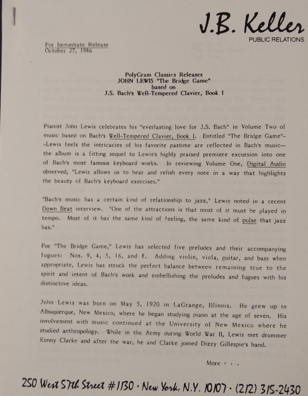 Incudes 2 page press release from J.B. Keller public relations NYC.