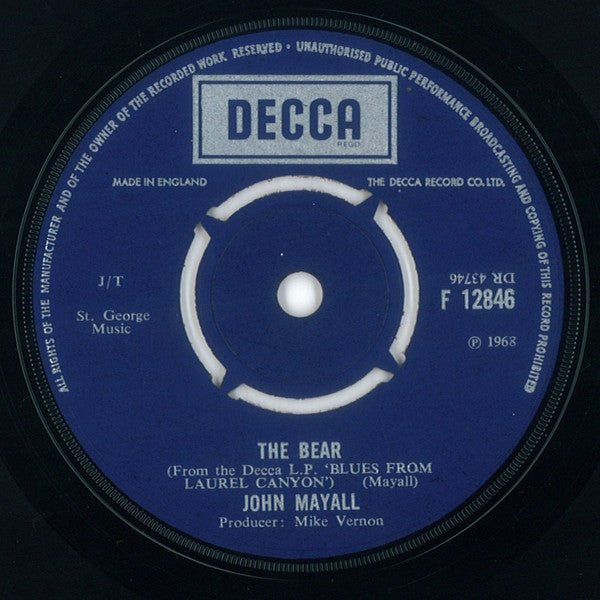 Boxed Decca Label First Cat. Nr. on label. Second Cat. Nr. on sleeve. UK single released with Dutch sleeve. In Holland A side was The Bear.