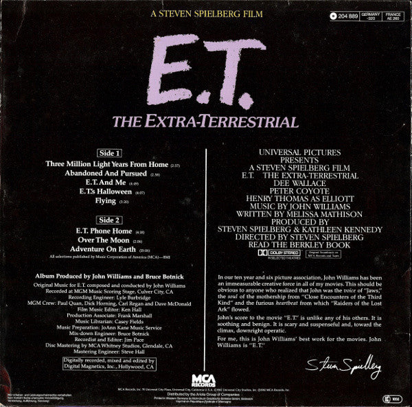 A1. Three Million Light Years From Earth 2:57 A2. Abandoned And Pursued 2:58 A3. E.T. And Me 4:49 A4. E.T.'s Halloween 4:07 A5. Flying 3:20 B1. E.T. Phone Home 4:18 B2. Over The Moon 2:06 B3. Adventure On Earth 15:06
