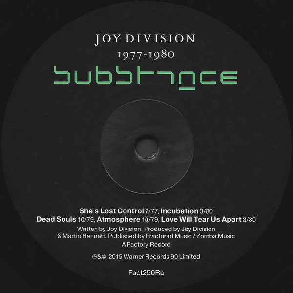 Issued with two printed inner sleeves housed in a replica of the original single pocket jacket. Some copies do not include the download code and sticker 1. A1, A2: 12/77, A3: 12/78, A4: 4/79, A5: 7/79 B1: 7/77, B2, B5: 3/80, B3, B4: 10/79 Sticker 1: [Vinyl Collector logo Includes download code for MP3 version of the album www.thisisvinylcollector.com Sticker 2: Joy Division Substance 180gm heavyweight vinyl Replicating original album artwork, cut from the 2010 '+–' audio remasters Includes two additional tracks 'As You Said' 'Love Will Tear Us Apart' Pennine version Spine, rear sleeve, labels: A Factory Record Rear sleeve, inner sleeves, labels: ℗&© 2015 Warner Records 90 Limited Inner sleeve 1: 'Energie-Piek ijs' (detail) by Jan Van Munster, 1981 © Jan Van Munster / DACS 1988 Runouts are etched.