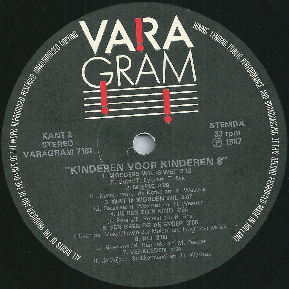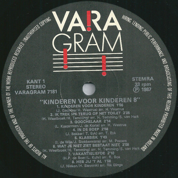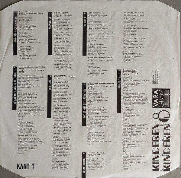 A1. Kinderen Voor Kinderen 1:56 A2. Ik Trek Me Terug Op Het Toilet 3:05 A3. Goochelaar 2:14 A4. In De Soep 2:58 A5. Klassiek 1:43 A6. Wat Je Niet Ziet Bestaat Niet 2:08 A7. Vakantieliefde 2:10 A8. Heb Jij 't Al? 1:58 B1. Moeders Wil Is Wet 3:13 B2. Miepie 2:29 B3. Wat Ik Worden Wil 2:07 B4. Ik Ben Zo'n Kind 2:55 B5. Eén Been Op De Stoep 3:05 B6. Hij 3:00 B7. Verkleden 2:34