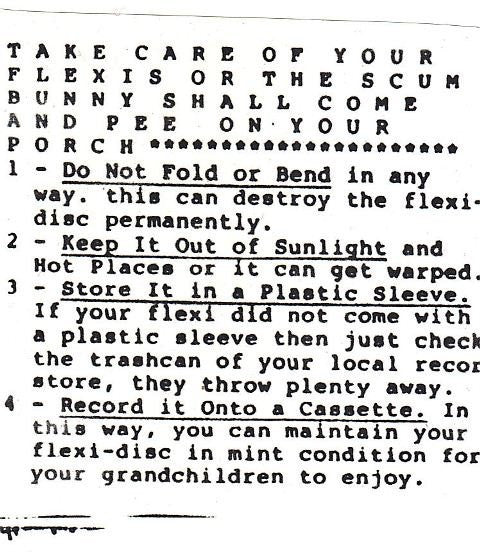 Packaged inside two green, recycled pieces of paper with printed lyrics, art and other information. A white paper insert is included encouraging owners to take good care of the flexi or else the "scum bunny shall come and pee on your porch."