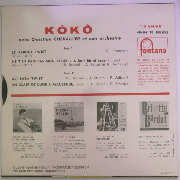 A1. Claude François - Belles ! Belles ! Belles ! (Girls, Girls, Girls, (Made To Love)) 2:10 A2. Claude François - J'y Pense Et Puis J'oublie (It Comes And Goes) 2:18 A3. Claude François - Si J'avais Un Marteau (If I Had A Hammer) 3:03 A4. Claude François - Même Si Tu Revenais 2:15 A5. Claude François - La Ferme Du Bonheur (Mockin' Bird Hill) 3:10 A6. Claude François - Quand Un Bateau Passe (Trains, And Boats, And Planes) 2:40 A7. Claude François - C'est La Même Chanson 2:55 A8. Claude François - Une Petite Larme M'A Trahi 3:01 B1. Claude François - Comme D'Habitude 4:15 B2. Claude François - Le Jouet Extraordinaire (The Marvelous Toy) 2:36 B3. Claude François - Pauvre Petite Fille Riche 3:00 B4. Claude François - Marche Tout Droit (Walk Right In) 2:03 B5. Claude François - Donna Donna (Le Petit Garçon) 2:32 B6. Claude François - Y'a Le Printemps Qui Chante (Viens A La Maison) 3:36 B7. Claude François - Petite Mêche De Cheveux 2:22 B8. Claude François - Les Choses De La Maison (The Things In This House) 2:19 . 45t Bonus C1. Kôkô - Le Nabout Twist 2:23 C2. Kôkô - Ne T'en Fais Pas Mon Vieux 2:35 D1. Kôkô - Ali Baba Twist 2:21 D2. Kôkô - Un Clair De Lune A Maubeuge 2:22