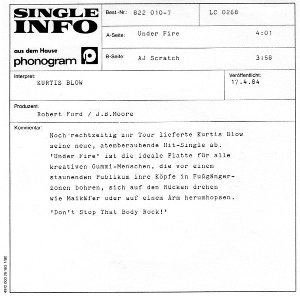 On back sleeve: Auch als Maxi-Version 822 010 Q erhältlich Herausgeber: Phonogram GmbH Hamburg On labels: [Side A: Neutr. Gray Mus. Mokojumbi Mus. BMI [Side B: Kuwa Music ℗ 1984 PolyGram Rec., Inc., U.S.A. Made in West Germany