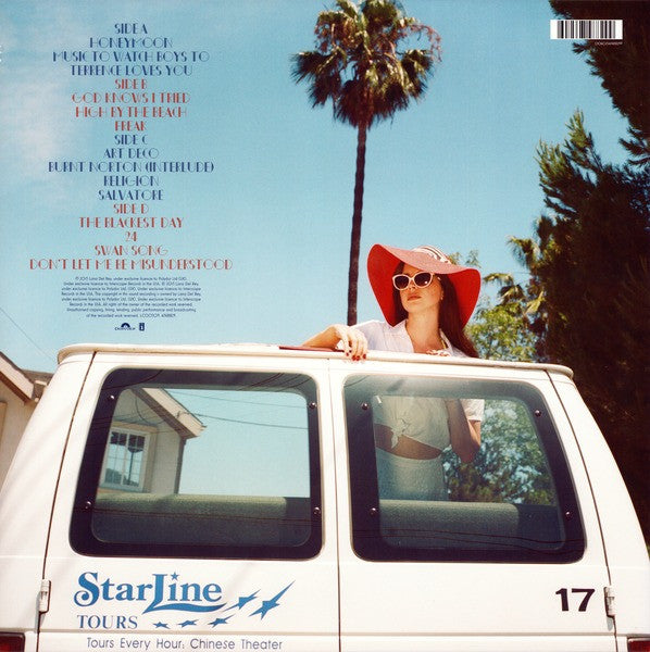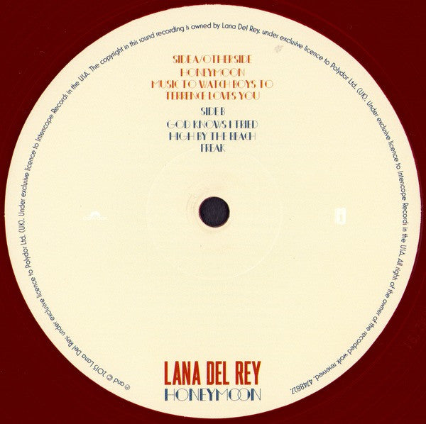 ℗ 2015 Lana Del Rey, under exclusive license to Polydor Ltd (UK). Under exclusive license to Interscope Records in the USA. © 2015 Lana Del Rey, under exclusive license to Polydor Ltd (UK). Under exclusive license to Interscope Records in the USA. Issued in a gatefold sleeve. Comes with printed inner sleeves and 16-page booklet and download code. "LANA DEL REY" and "HONEYMOON" have glossy embossing on the cover.