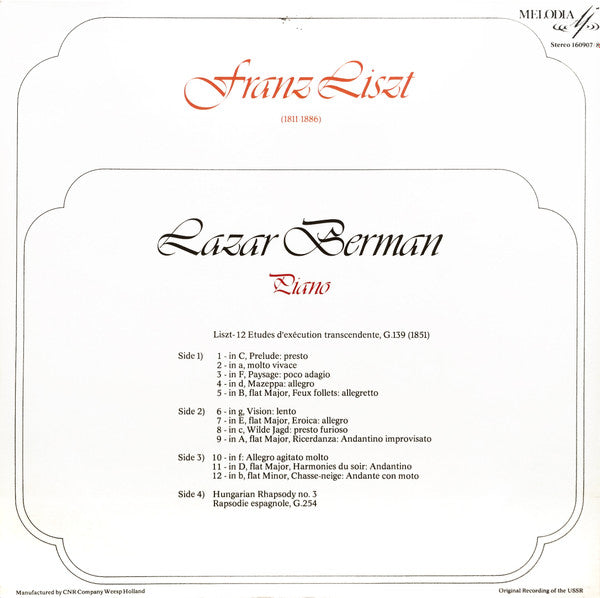 On spine: Liszt · Lazar Berman - Piano Melodia 160907/8
