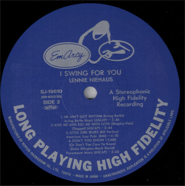 Artist is named "Lenny" Niehaus on front cover. "Lennie" Niehaus (his usual spelling) is used on back cover, spine, label and in the liner notes, including where the musicians are described.