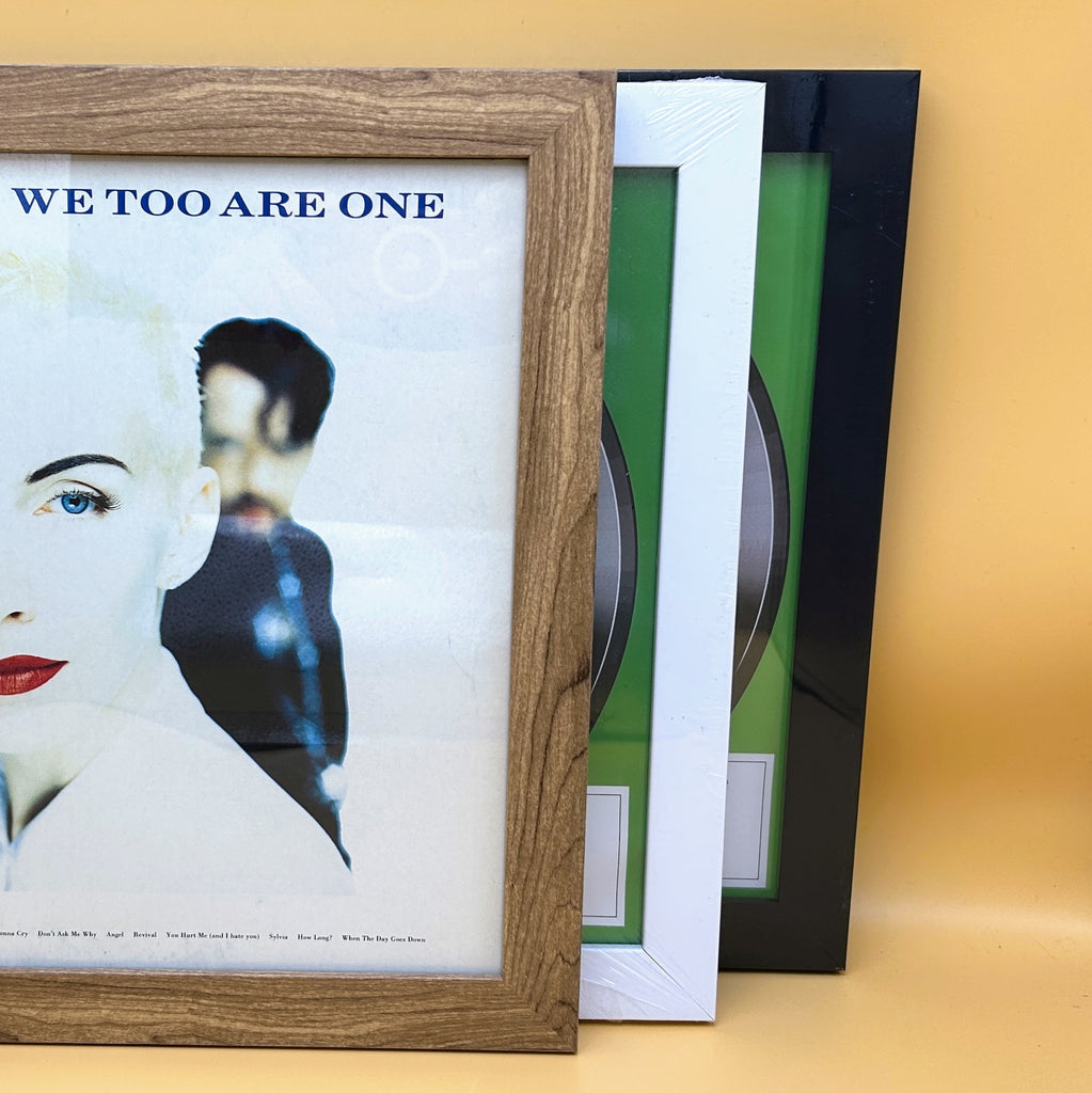 Lijst voor 12" vinyl platen om aan de muur te hangen. Door een plastic schuim achterwand passen zowel enkele als dubbel LP's erin. Te verkrijgen in 3 kleuren: houtlook, zwart en wit.