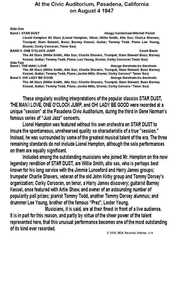 Gene Norman Presents from the "Just Jazz" Concert at the Civic Auditorium, Pasadena, California on August 4 1947.