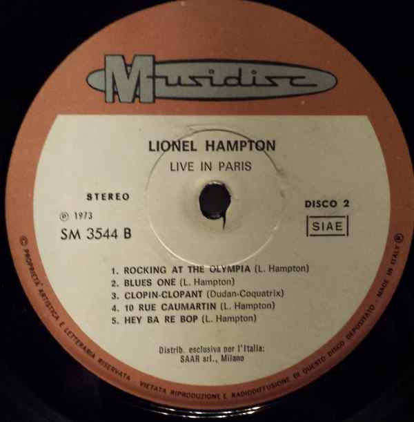 Title on sleeve: Lionel Hampton In Paris Vol. 2. Ⓒ Proprietà Artistica Letteraria Riservata Ⓟ 1973 Contrary to the release title, this is the concert recorded at L'Olympia on 28 and 30 January, 1956, early in Hampton's European tour of that year.