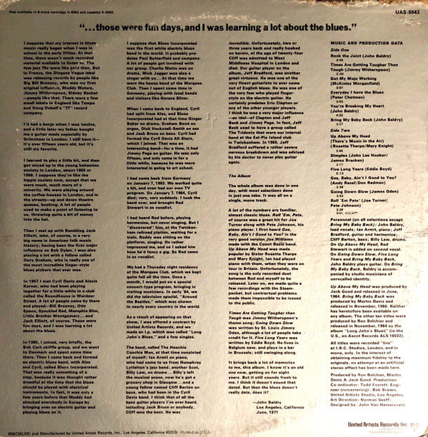 — Front cover: 12 classic performances by Long John Baldry and The Hoochie Coochie Men recorded in London 1964-1966 [sic ©MCMLXXI United Artists Records, Inc. Monaural • can be played on stereo equipment — Back cover: Also available in 8-track cartridges U-8303 and cassette K-0303 [B1 was [… released in June, 1964. [A6 was [… released in November, 1966. The other ten titles were [… released in November, 1964 as the album “[r=2615564” (in the U.S., on Ascot Records ALS 16022). All titles were recorded “live” at I.B.C. Studios, London, and in mono, only. In the interest of obtaining maximum fidelity to the originals, no attempts at an artificial stereo effect has been made here. ©MCMLXXI and Manufactured by United Artists Records, Inc., Los Angeles, California 90028 Printed in U.S.A. — Labels: • United Artists Records, Inc., Los Angeles, California 90028 • Made in U.S.A. •
