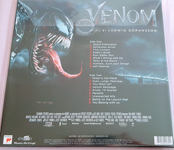 A1. Space Exploration 4:23 A2. Symbiotes Arrive 2:03 A3. First Contact 3:29 A4. Eddie’s Blues 4:50 A5. Run, Eddie, Run 1:47 A6. What’s Wrong With Me 2:33 A7. Panic At The Bistro 1:23 A8. Humans...Such Poor Design 2:55 A9. Self Defense 3:38 B1. Pedal To The Metal 3:50 B2. Eyes, Lungs, Pancreas 2:45 B3. You Want Up? 1:40 B4. Venom Rampage 3:03 B5. Annie, I’m Scared 1:47 B6. Parasite 2:57 B7. Unexpected Ally 0:51 B8. Battle On The Launch Pad 8:18 B9. You Belong With Us 3:09