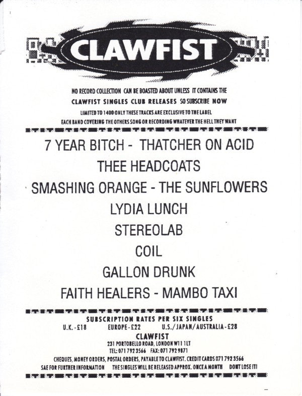 This 7" comes in a gatefold sleeve with an white inner sleeve and an announcement paper from Clawfist with other releases from that time.
