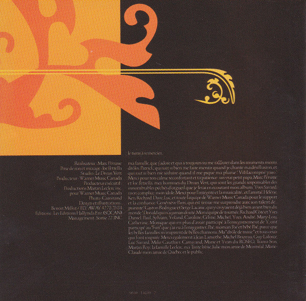 Recorded and mixed at studio Le Divan Vert, except tracks 1, 2, 6 & 7 recorded live at Théâtre Palace de Granby (18 September 1993) and at Cinquième Salle de la Place des Arts, Montreal (7 & 8 May 1995).