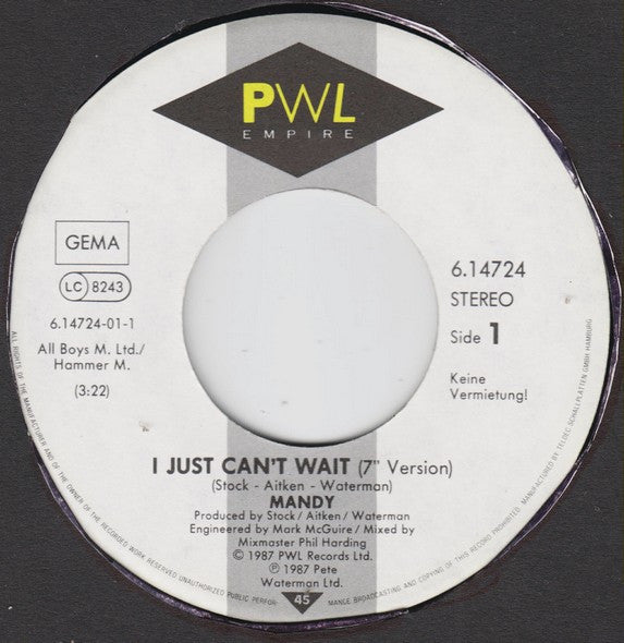 Title side A on sleeve: I Just Can't Wait