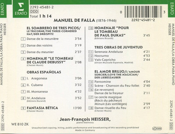 Manuel De Falla, Jean-François Heisser - La Obra Para Piano (= L'œuvre Pour Piano = Piano Works = Klavierwerke) (CD, RE)