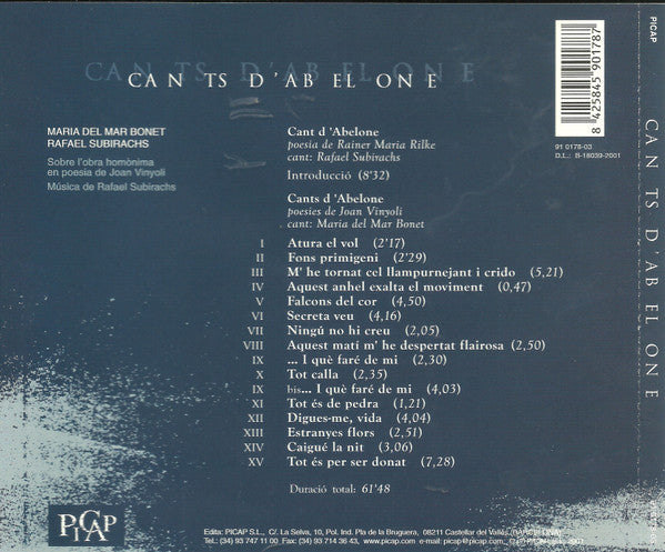 . Cant D'Abelone 1. Introducció 8:32. Cants D'Abelone 2. I - Atura El Vol 2:173. II - Fons Primigeni 2:294. III - M'He Tornat Cel Llampurnejant I Crido 5:215. IV - Aquest Anhel Exalta El Moviment 0:476. V - Falcons Del Cor 4:507. VI - Secreta Veu 4:168. VII - Ningú No Hi Creu 2:059. VIII - Aquest Matí M'He Despertat Flairosa 2:5010. IX - ... I Què Faré De Mi 2:3011. X - Tot Calla 2:3512. IX bis - ... I Què Faré De Mi 4:0313. XI - Tot És De Pedra 1:2114. XII - Digues-Me, Vida 4:0415. XIII - Estranyes Flors 2:5116. XIV - Caigué La Nit 3:0617. XV - Tot És Per Ser Donat 7:28