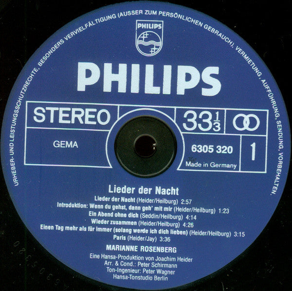 A1. Lieder Der Nacht 2:57 A2. Introduktion: Wenn Du Gehst, Dann Geh Mit Mir 1:23 A3. Ein Abend Ohne Dich 4:14 A4. Wieder Zusammen 4:26 A5. Einen Tag Mehr Als Für Immer 3:15 A6. Paris 3:36 B1. Marleen 4:27 B2. Ich Geh' Mit Dir, Wohin Du Willst 6:44 B3. Wir Können Es Beide, Wenn Wir Es Nur Woll'n 9:21 B4. Lieder Der Nacht (Instrumental) 3:22