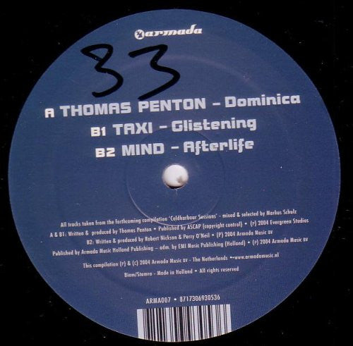 Track B1 is mistakenly credited to Thomas Penton on the label. Side A plays at 45 RPM, side B plays at 33 ⅓ RPM --------- All tracks taken from the forthcoming compilation 'Coldharbour Sessions' - mixed and selected by Markus Schulz. A: Published by ASCAP (copyright control). (P) 2004 Evergreen Studios. B1: Published by Armada Music Publishing Holland - adm. by EMI Music Publishing (Holland) (P) Filo & Peri B2: (P) 2004 Armada Music BV. Published by Armada Music Holland Publishing - adm. by EMI Music Publishing (Holland). (P) 2004 Armada Music BV. This compilation (P) & (C) 2004 Armada Music BV - The Netherlands. Biem/Stemra - Made in Holland.