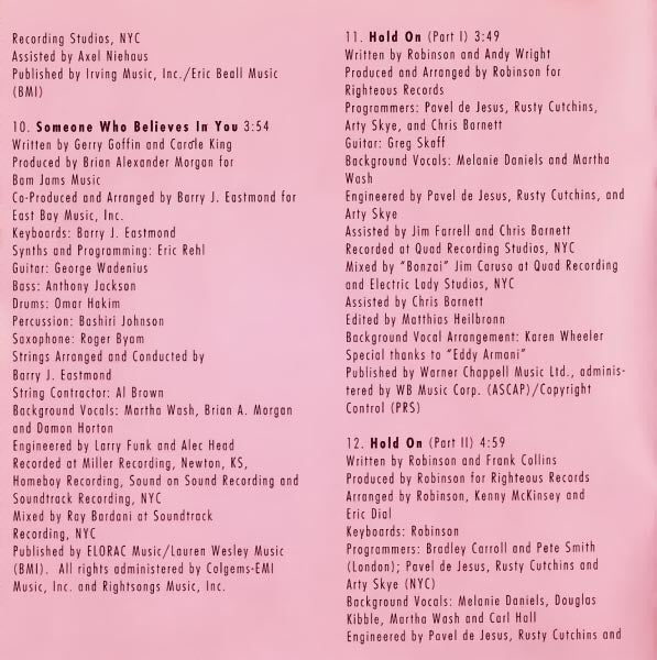 "Hold On (Part II)" Published by Warner Chappell Music Ltd., administered by WB Music Corp. (ASCAP) / Frank Collins (PRS). Written and produced for Righteous Records. Recorded at Quad Recording Studios, NYC. Mixed at Quad Recording and Electric Lady Studios, NYC.