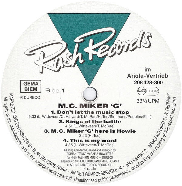 Main artist listed as "MC Miker "G"" (on front cover, back cover and inner sleeve) and "M.C. Miker 'G'" (on labels).