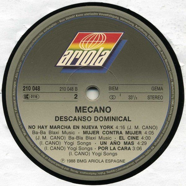 ℗ 1988 BMG Ariola Espagne ℗ & © 1988 Ariola Eurodiscs, S.A. Comes with inner sleeve including credits and lyrics in Spanish. Track duration on label is slightly different.