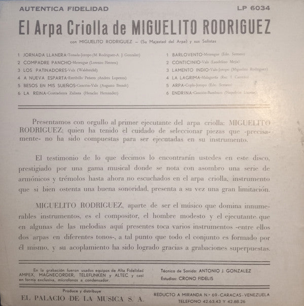 Miguelito Rodriguez - El Arpa Criolla (LP, Album, Mono)