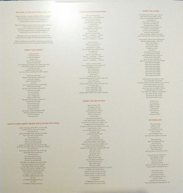 Similar to [r=27013134 but different runouts. Runouts are etched. Clear vinyl. Issued in a gatefold sleeve with spot gloss varnish detail to the front (on the placard). The interior section of the gatefold disc holding pocket is printed red, which co-ordinates with the colour scheme of the inner sleeve. Includes a printed cardboard inner sleeve with a die-cut hole to reveal the label on the disc. Credits and thank yous on one side and a photo of Morrissey on the other. Includes a credit card sized download voucher, printed on both sides. Hype sticker on the shrink wrap. A limited number of 250 copies were issued with a 12" art print and sold exclusively by jpc.de beginning 2017-11-24. [Back cover: ℗ & © 2017 BMG Rights Management (UK) Limited [Labels: Recorded in Italy [Inner sleeve: The Players: [... all of whom played many other instruments apart from the above Recording began at Forum Music Village in Rome (Italy), and then moved to La Fabrique at St-Remy (France) Recording took place during June, July and August 2017 Strings and horns [... recorded [... at Sunset Sound, Los Angeles Morrissey is managed [... at Deckstar (Los Angeles) This recording is dedicated to Dick Gregory (1932-2017) deathless, deathless, deathless Tracks 1 and 4 [A1 and A4 [... (Copyright Control/BMI - Zepol M Songs) Tracks 2, 3, 9 and 11 [A2, A3, B3 and B5 [... (Copyright Control/Domino Publishing) Tracks 5, 7, 8 and 12 [A5, B1, B2 and B6 [... (Copyright Control/Phoenixbear Music ASCAP) Tracks 6 and 10 [A6 and B4 [... (Copyright Control/BMI - 8stiches9lives Publishing.)