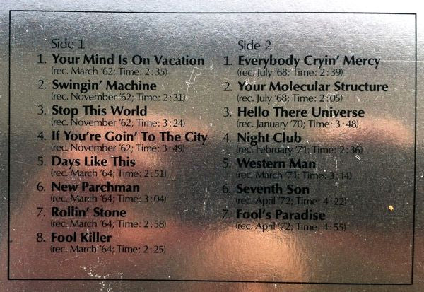 A1. Your Mind Is On Vacation 2:35 A2. Swingin' Machine 2:31 A3. Stop This World 3:24 A4. If You're Goin' To The City 3:49 A5. Days Like This 2:51 A6. New Parchman 3:04 A7. Rollin' Stone 2:58 A8. Fool Killer 2:25 B1. Everybody Cryin' Mercy 2:39 B2. Your Molecular Structure 2:05 B3. Hello There Universe 3:48 B4. Night Club 2:36 B5. Western Man 3:14 B6. Seventh Son 4:22 B7. Fool's Paradise 4:55