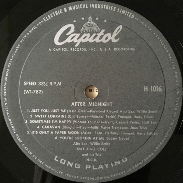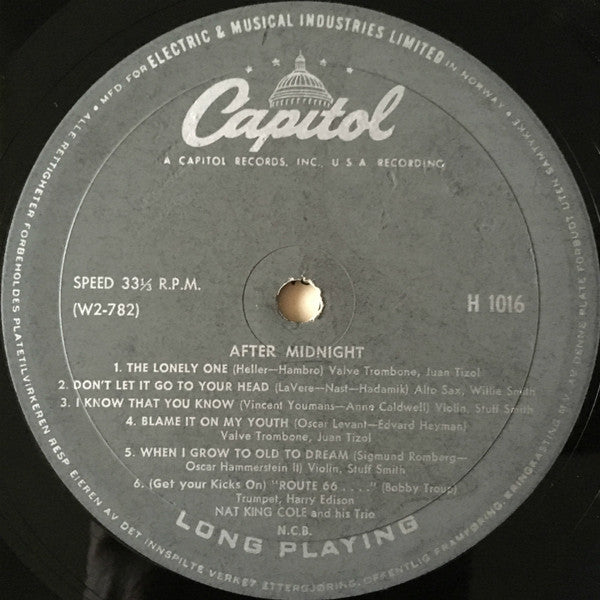 Norwegian release housed in UK printed sleeve. Recorded August and September, 1956, in Hollywood Label catalog no. H 1016. Sleeve catalog no. H 56. Manufactured for Electric & Musical Industries Limited in Norway. Distributed in Great Britain by Electric & Musical Industries Ltd. Distributed outside Great Britain by E.M.I. International Limited Black Capitol label with silver lettering.