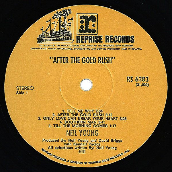 Dutch release of this album, most likely 1970 release. - with insert - sleeve laminated front and rear (Not inside gatefold) - the sleeve credits only Nils Lofgren on piano (later sleeves credit Neil Young, Nils Lofgren and Jack Nitzsche) - the labels have 31,009 on side 1 and 31,010 on side 2. - track B6 titled "Cripple Creek Ferry" on vinyl label and "Crippled Creek Ferry" on back cover. - catalog numbers are "RS 6383" on spine and vinyl labels, and "6383" on back cover. Most of these songs were inspired by the Dead Stockwell-Herb Berman screenplay "After The Goldrush".