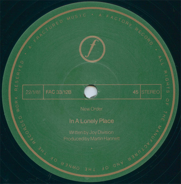 Three versions of the green sleeved issue exist: Version 1 (this one) - (Dark) British racing green, bronze type and border. Version 2 ([r=23212376) - (Dark) British racing green, bronze type and border. MVS re-issue of version 1. Version 3 ([r=7125430) - (Lighter) Forest green, gold type and border. There were two different editions of the record released using this sleeve: 1) Original version of "Ceremony" (without Gillian Gilbert) (this one). Side A groove etching: "Watching Love Grow - Forever" 2) Re-recorded version of "Ceremony" (with Gillian Gilbert) ([r=24986659). Side A groove etching: "This Is Why Events Unnerve Me". This version of the record was released in the new cream & blue sleeve, but there were green sleeves left over from the original pressing which were used rather than being discarded. The cover and runoffs of the record states the catalogue number as FAC 33 (the same as the 7"), but the label state FAC 33/12, denoting the 12" release. Although the centre labels have the date 22/1/81 as part of the artwork, this release came out in March.