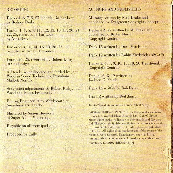 Unless otherwise noted: all songs performed by Nick Drake on vocals with guitar or piano accompaniment.