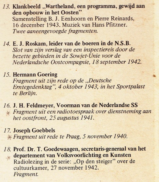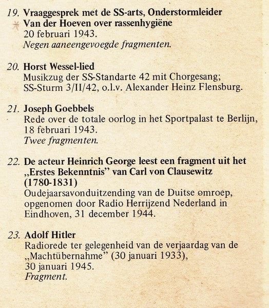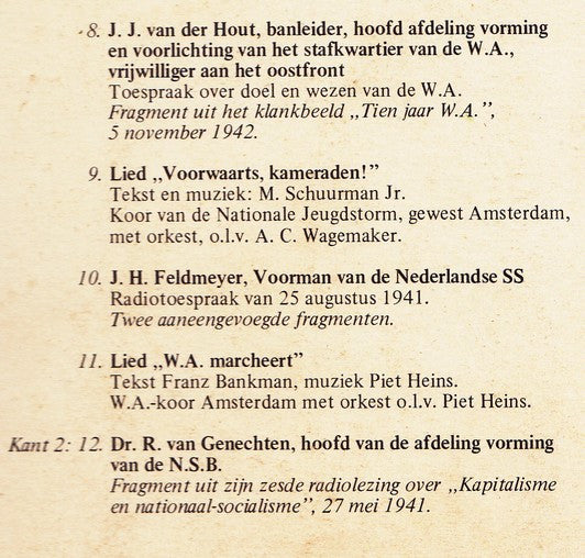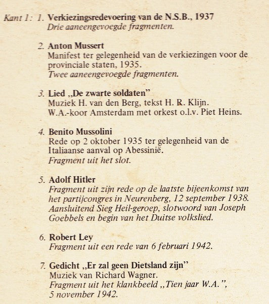 A1. Verkiezingsredevoering Van De N.S.B., 1937 A2. Manifest .. (1935) A3. Lied : De Zwarte Soldaten" A4. Rede 2 Oktober 1935 A5. Fragment Partijcongres Neurenberg, 12 September 1938 A6. Fragment Rede 6 Februari 1942 A7. Gedicht "Er Zal Geen Dietsland Zijn" A8. Toespraak Over Doel En Wezen Van De W.A. A9. Lied "Voorwaarts Kameraden" A10. Radiotoespraak 25 Augustus 1941 A11. Lied "W.A. Marcheert" B1. Fragment 6de Radiolezing: Kapitalisme En Nationaal-Socialisme, 27 Mei 1941 B2. Klankbeeld "Wartheland, Een Programma, Gewijd Aan Den Opbouw In Het Oosten B3. Slot Van Zijn Verslag.. Nederlandsche Oostcompagnie, 18 September 1942 B4. Fragment "Deutsche Erntegedenktag", 4 Oktober 1943 B5. Fragment Uit vEen Radiotoespraak Over Dienstneming Aan Het Oostfront, 25 Augustus 1941 B6. Fragment Uit Rede Te Praag, 5 November 1940 B7. Fragment "Op De Steiger", 27 November 1942 B8. Vraaggesprek Rassenhygiëne B9. Horst Wessel Lied B10. Rede Over De Totale Oorlog, 18 Februari 1943 B11. Oudejaarsuitzending Van De Duitse Omroep B12. Radiorede Ter Gelegenheid Van De Verjaardag Van De "Machtübernahme", 30 Januari 1945