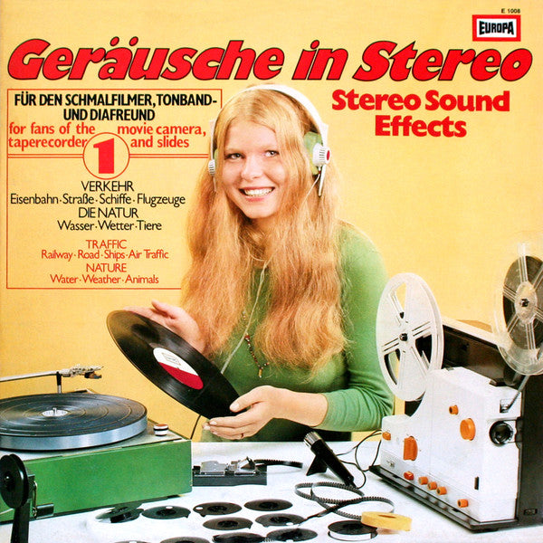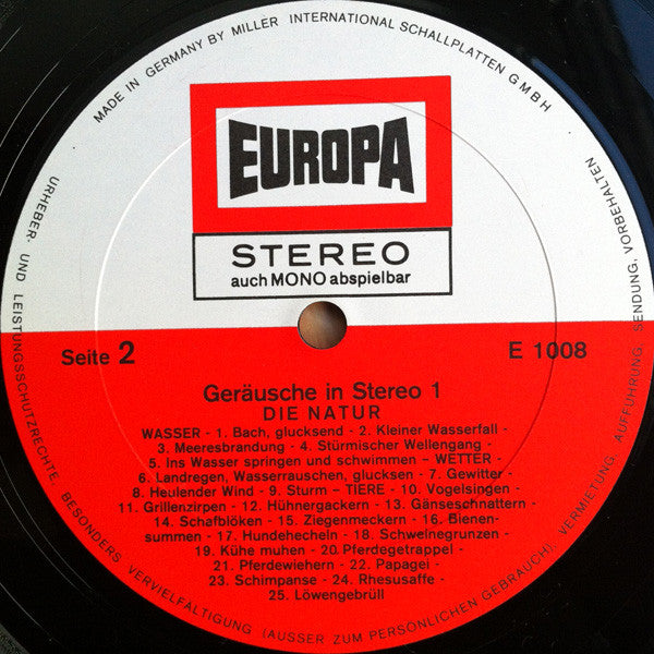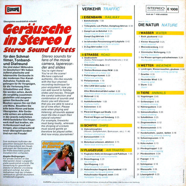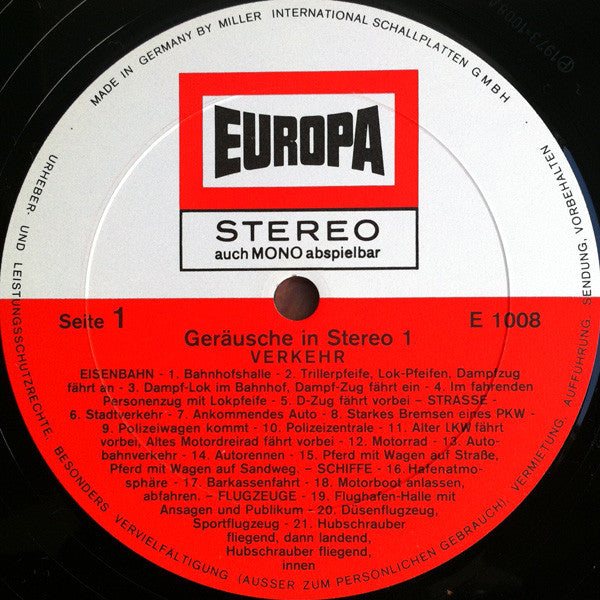 Release title on spine and labels: Geräusche in Stereo 1. Total running time approx. 26 minutes. Some copies were distributed with colour printed inner sleeves that featured advertisements from Lux filter cigarettes [see images.
