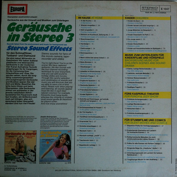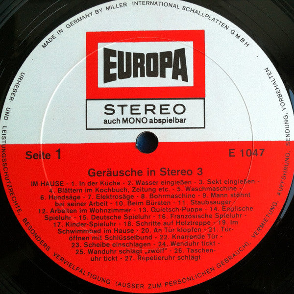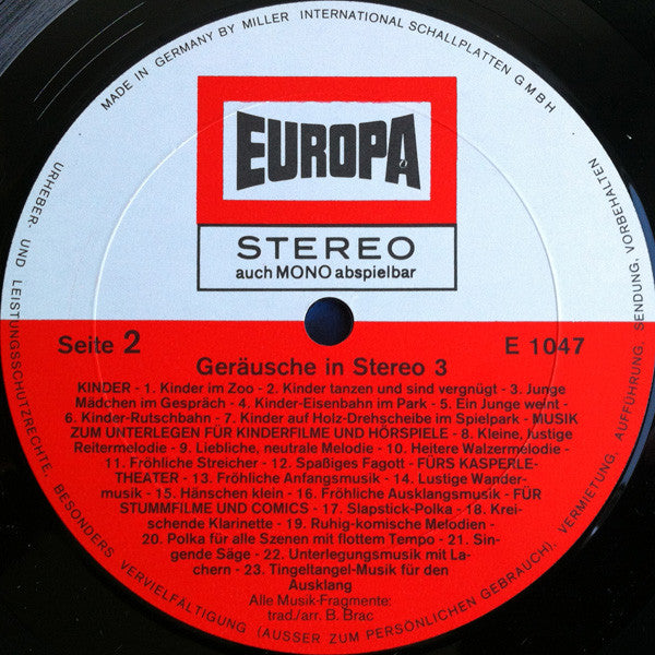 A1. In Der Küche 2:58 A2. Wasser Eingießen 0:06 A3. Sekt Eingießen 0:20 A4. Blättern Im Kochbuch, Zeitung Etc. 0:20 A5. Waschmaschine 0:45 A6. Handsäge 0:16 A7. Elektrosäge 0:24 A8. Bohrmaschine 0:14 A9. Mann Stöhnt Bei Seiner Arbeit 0:23 A10. Beim Bürsten 0:14 A11. Staubsauger 0:22 A12. Arbeiten Im Wohnzimmer 2:28 A13. Quietsch-Puppe 0:18 A14. Englische Spieluhr 0:42 A15. Deutsche Spieluhr 0:43 A16. Französische Spieluhr 0:31 A17. Kinder-Spieluhr 0:28 A18. Schritte Auf Holztreppe, Auf Und Ab, Schnell Und Langsam 0:35 A19. Im Schwimmbad Im Hause 0:42 A20. An Tür Klopfen 0:17 A21. Türöffnen Mit Schlüsselbund 0:11 A22. Knarrende Tür 0:07 A23. Scheibe Einschlagen 0:05 A24. Wanduhr Tickt 0:35 A25. Wanduhr Schlägt "Zwölf" 0:31 A26. Taschenuhr Tickt 0:23 A27. Repetieruhr Schlägt 0:13 . Kinder B1. Kinder Im Zoo 0:38 B2. Kinder Tanzen Und Sind Vergnügt 0:38 B3. Junge Mädchen Im Gespräch 0:15 B4. Kinder-Eisenbahn Im Park 0:55 B5. Ein Junge Weint 0:23 B6. Kinder-Rutschbahn 0:46 B7. Kinder Auf Holzdrehscheibe Im Park 0:35 . Musik Zum Unterlegen Für Kinderfilme Und Hörspiele B8. Kleine, Lustige Reitermelodie 0:23 B9. Liebliche, Neutrale Melodie 0:29 B10. Heitere Walzermelodie 0:27 B11. Fröhliche Streicher 0:23 B12. Spaßiges Fagott 0:30 . Fürs Kasperle-Theater B13. Fröhliche Anfangsmusik 0:26 B14. Lustige Wandermusik 0:27 B15. Hänschen Klein 0:35 B16. Fröhliche Ausklangsmusik 0:26 . Für Stummfilme Und Comics B17. Slapstick-Polka Für Verfolgungsjagden 0:47 B18. Kreischende Klarinette Mit Lachern Für Komische Szenen 0:56 B19. Ruhig-Komische Melodien Für Nicht Ernstzunehmende Liebes-Szenen 0:56 B20. Polka Für Alle Szenen Mit Flottem Tempo 0:48 B21. Singende Säge Für "Friedliche" Idylle 0:32 B22. Unterlegungsmusik Mit Lachern Für Heitere Spielszenen 1:15 B23. Tingeltangel-Musik Für Den Ausklang 1:22
