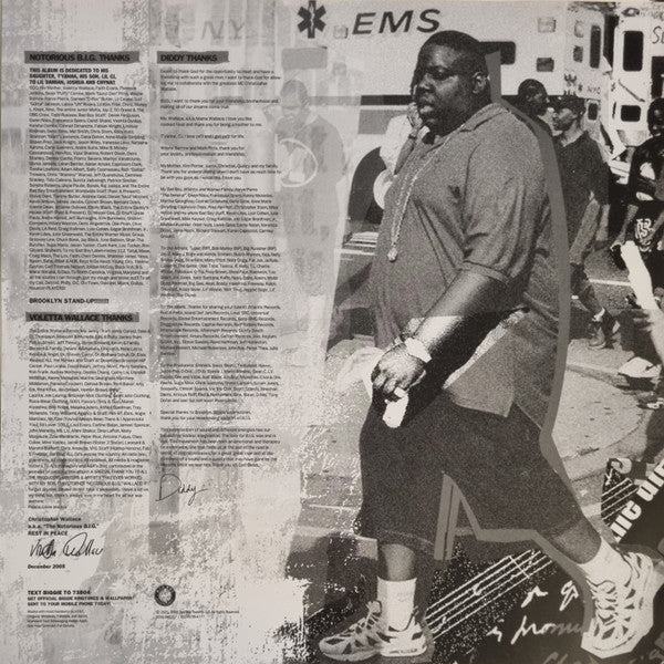 This was made for Record Store Day 2021 drop 1. The shrink wrap has two stickers, a hype sticker with information about the release, and a silver Record Store Day Exclusive sticker. The tracklisting is printed on the back sequentially. Includes a double-sided lyric sheet. Missy Elliott is spelled correctly on the back cover, however her name is spelled as Missy Elliot on the lyric sheet. The bonus 7" has no credits or mention anywhere on the packaging aside from the hype sticker, and it is a large spindle, although the label printed is one meant for a small spindle, so most of the text on it is cut off, meaning the song titles never appear in full anywhere on the release. Final Collection From Biggie on Red/Black Swirl Vinyl Includes Exclusive 7" With 2 Bonus Cuts Limited Edition of 10,000 Ⓒ 2001, 2005, ℗ 2005 Bad Boy Records LLC. All Rights Reserved. Manufactured for & Distributed by Atlantic Recording Corportation, a Warner Music Group Company, 777 S. Santa Fe Ave., Los Angeles, CA 90021. Unauthorized duplication is a violation of applicable laws. Made in Czech Republic. A1. Biggie appears in 1996 in Portmore Jamaica at the Jamworld Entertainment Centre. Recording courtesy of Contractor Music Group-Ocho Rios Jamaica. A2. Eminem appears courtesy of Aftermath Entertainment/Interscope Records. Obie Trie appear courtesy of Shady Records/Interscope Records. Contains excerpts from "Kick In The Door" performed by Notorious B.I.G. courtesy of Bad Boy Records and "Victory" performed by Puff Daddy courtesy of Bad Boy Records. A3. Twista appears courtesy of Atlantic Records. Contains excerpts from "Notorious Thugs" performed by Notorious B.I.G., courtesy of Bad Boy Records; and "My Ship Is Coming In" performed by Walter Jackson courtesy of Sony BMG Entertainment. A4. Jay-Z appears courtesy of Roc-a-fella/Def Jam. Jay-Z recorded for L'Oreal Inc. Production Coordinator- William E. Pettaway Jr. for Pettaway Music, Inc. A5. Fat Joe Recorded by David Hyman for In Da Ruff. Big Pun appears courtesy of Sony Records. Fat Joe appears courtesy of Atlantic Records. Freeway appears courtesy of Roc-a-fella/Def Jam. Contains excerpts from "My Downfall" performed by Notorious B.I.G., courtesy of Bad Boy Records. B6. Snoop Dogg recorded for Doggystyle Records. Snoop Dogg appears courtesy of Doggystyle Records. Ludacris and Bobby Valentino appear courtesy of Capitol Records. Contains excerpts from "Take Time To Tell Her" performed by Jerry Butler courtesy of Mercury/UME and "Let Me Get Down" performed by Notorious B.I.G. courtesy of Bad Boy Records. B7. Recorded for Skylar Jamz B8. The Game appears courtesy of Aftermath/Interscope Records. Faith Evans appears courtesy of Capitol Records. Contains excerpts from "Respect" performed by Notorious B.I.G. courtesy of Bad Boy Records. B9. Nelly appears courtesy of Derrty Entertainment/Universal Records, a division of UMG Recordings, Inc. Avery Storm appears courtesy of Derrty Entertainment/Universal Records, a division of UMG Recordings, Inc. Jagged Edge appears courtesy of Sony Urban Music/Columbia. Contains excerpts from "Nasty Boy" performed by Notorious B.I.G. courtesy of Bad Boy Records. B10. Engineered for NQC Management. Concertmaster Recorded by Ryan West for N.Q.C. Management. Mixed by Young Guru for Loreal, Inc, Assisted by David Brown for N.C.Q. Management. 2Pac appears courtesy of Amaru Records/Interscope. Mary J. Blige appears courtesy of Geffen Records. Nas appears courtesy of Sony Urban Music/Columbia. Contains excerpts from "Blue Sky Silver Bird" performed by Lamont Dozier. B11. Mixed by Steve Sola for Plain Truth Entertainment. Lil' Wayne appears courtesy of Cash Money/Universal Records. Juelz Santana appears courtesy of Def Jam. Contains excerpts from "Ready To Die" performed by Notorious B.I.G. courtesy of Bad Boy Records. Contains an interpolation from "Halloween," performed by John Carpenter. C12. Mobb Deep appears courtesy of G-Unit Records/Shady/Aftermath/Interscope. Contains excerpts from "My Other Love" performed by Bunny Sigler courtesy of Sony Records and "What's Beef" performed by Notorious B.I.G. courtesy of Bad Boy Records. C13. Recorded by Skid for Skid Sounds C14. Scarface appears courtesy of Global Entertainment Network. Akon appears courtesy of SRC Records/Universal. Contains excerpts from "You'll See" performed by Notorious B.I.G. courtesy of Bad Boy Records. C15. Additional Recording by David Hyman for In Da Ruff. T.I, appears courtesy of Grand Hustle/Atlantic Records. Slim Thug appears courtesy Boss Hogg Outlawz Entertainment, Inc./Geffen. Contains excerpts from "Young G's" performed by P. Diddy courtesy of Bad Boy Records. C16. Missy Elliot appears courtesy of Goldmind/Atlantic Records Contains excerpts from "Drugs" performed by Lil' Kim. D17. R. Kelly and Charlie Wilson appear courtesy of Jive Records. Contains excepts from "Friend of Mine" performed by Notorious B.I.G. courtesy of Bad Boy Records. D19. Contains excerpts from "Johnny Was" performed by Bob Marley and the Wailers courtesy of Tuff Gong Records and excerpts from "Suicidal Thoughts" performed by Notorious B.I.G. courtesy of Bad Boy records. D20. Mixed by Steve Sola for Plain Truth Entertainment. The Clipse appears courtesy of Star Trak/Jive Records. Contains excerpts from "You're Nobody" and "Come On" performed by Notorious B.I.G. courtesy of Bad Boy Records. D21. KoRn appears courtesy of Virgin Records. Contains excerpts from "If I Die Before I Wake" performed by Notorious B.I.G. courtesy of Bad Boy Records.