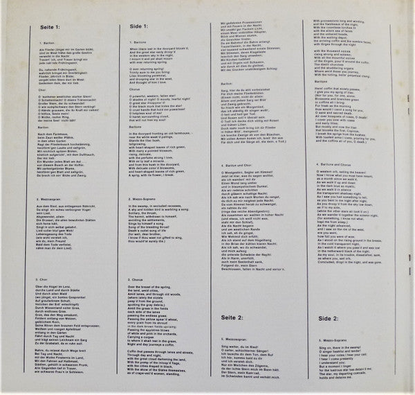 Uncredited liner notes in German, English and French and complete texts in German and English.