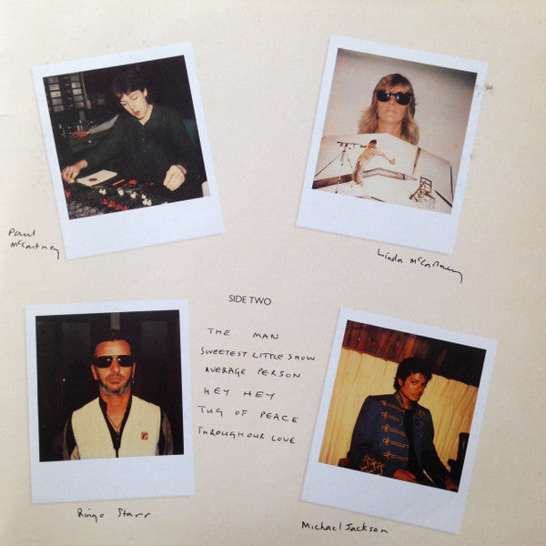 Released with a printed inner sleeve. [a15885 courtesy of [l61835. [a87519 courtesy of [l61835. [a267770 courtesy of [l880949. [a259352 courtesy of [l93407. 'Chair and Pipe' by Vincent Van Gogh reproduced by permission of the Trustees of the National Gallery, London. 'Can Gogh's Chair' chrome sculpture 1966. A1, A3 to A5, B2, B3, B5, B6 published by MPL Communications Ltd. A2, B1 published by MPL Communications Ltd./Copyright Control B4 published by MPL Communications Ltd./Intersong Music Ltd. administered by MPL Communications Ltd. A1, A3, A5 to B2, B5, B6 ℗ 1983 Original sound recordings made by MPL Communications Ltd. A2, A4, B3, B4 ℗ 1983 Original sound recordings made by MPL Communications Inc. Many thanks to the following folks, without whom... [a257417, [a201111, [a4795323 (tabla), [a2420899, [a252118, [a47375, [a457690, [a299379, Chris Smith (harmonica), [a255142, [a260572, [a271409, [a252993, Hughie Burns, Gavin Wright, [a11470. [a1293429, [a2269991, Steve Shrimpton, [a1910975, Bruce Bernard, [a1830526, [a480829, [a288874, [a332618, [a24860, [a4535099, [a1402363, [a1868631, Heather, Melinda, June, Pattie, Kim. [On back sleeve: Marketed, manufactured and distributed by EMI. Printed in Germany by 4P Nicolaus GmbH, Köln Embossed EMI logo on back sleeve down right [On label side A: Made in Germany For nearly same release but printed in Holland by EMI Services Benelux B.V. see here: [r5396291 Catalog numbers: 1C 064 1652301 - spine, back sleeve & labels 064 1652301 - inside gatefold 1652301 - Inner sleeve The runouts are stamped; the separated number after the "1D"-string is etched.