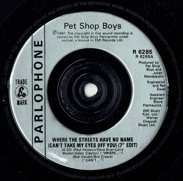 A: listed as "7" Edit" only on the record label. "Where the streets have no name" published by Blue Mountain Music Ltd. "Can't take my eyes off you" published by EMI Music Publishing Ltd. / Warner Chappel Music Ltd.