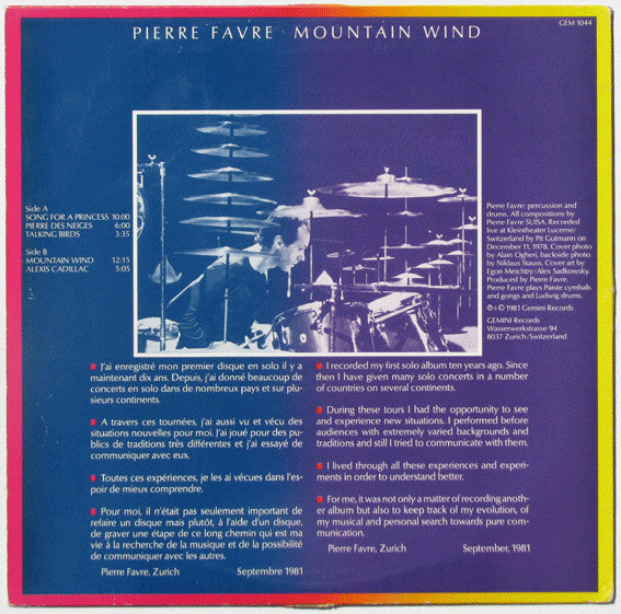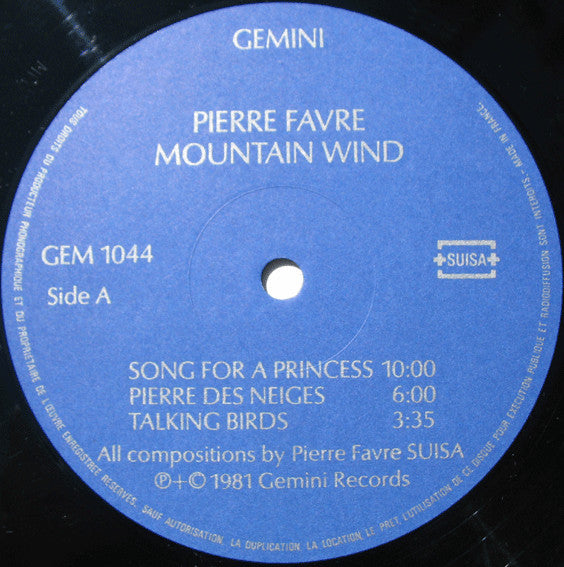 A1. Song For A Princess 10:00 A2. Pierre Des Neiges 6:00 A3. Talking Birds 3:35 B1. Mountain Wind 12:15 B2. Alexis Cadillac 5:05